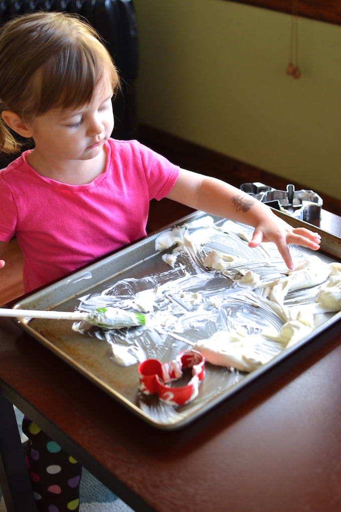 If your child isn’t interested in touching the whipped cream, you can provide them with tools to use. Em wasn’t too interested in getting her hands into it, so I gave her a pastry brush and some cookie cutters to play around with. She was done pretty quickly, but wanted to go back to it a few minutes later. As we do more of this “messy” sensory play, I think she’ll be more curious and eager to get her hands in there. And if not, that’s okay too. Wherever your child takes this activity is appropriate for them at that time.